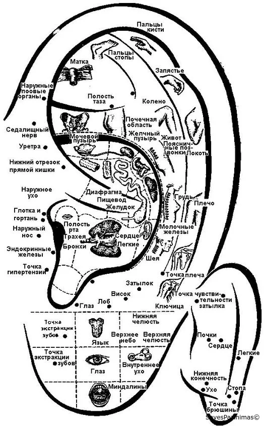 Исходя из этой ассоциации, на ушах находятся точки, которые отвечают за тот или иной орган.